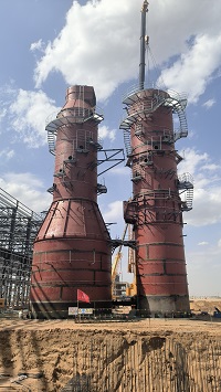天公作美,由我公司承建的鄂尔多斯新创新材料有限公司锂离子电池负极材料一体化项目石墨化炉净化系统工程一级塔于5月13日喜封金顶,二级塔吸收塔部分于5月18日吊装就位。在此期间,我公司按照鄂尔多斯新创甲方的要求,精心协调周密安排,战胜了现场多次沙尘暴的影响,克服了现场材料运输不便、土建吸收塔基础交付等困难,项目部抓紧时间加班加点,5月18日二座塔吸收段成功完成阶段性安装,为下一步防腐作业、设备安装、管道安装、电仪及调试运行、项目竣工验收打下良好基础。鄂尔多斯新创业主对我公司的这种吃苦、务实,能打硬仗、啃硬骨头的精神提出了表扬。