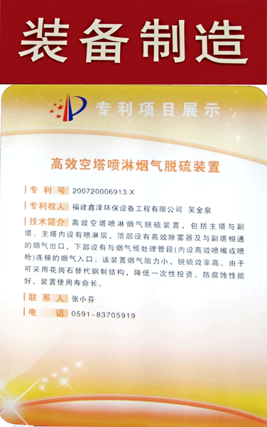 我公司专利“高效空塔喷淋烟气脱硫装置”展板与模型在福建省知识产权局优秀专利项目展区展示。