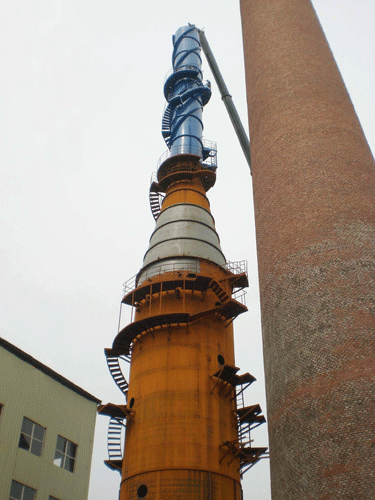 广西新合力冶金有限公司66m2烧结机烟气脱硫工程自开工建设以来,经过项目部及施工人员的共同努力,克服高温酷热天气和连续的下雨、以及停电造成的影响,于2012年8月16日吸收塔成功封顶,同时顺利完成60m的直排烟囱吊装施工。