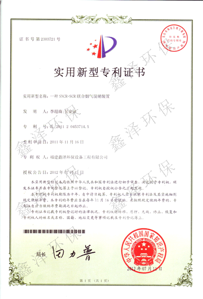 近日,由我公司申请的科研创新成果“一种SNCR-SCR联合烟气脱硝装置”荣获国家知识产权局实用新型专利证书。该技术于2011年11月提交专利申请,2012年7月获得专利授权。