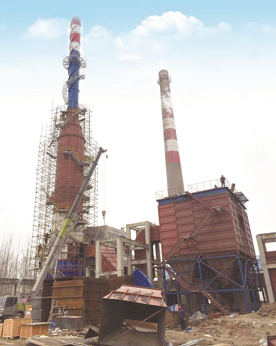 由我公司承建的许昌晨鸣纸业股份有限公司25t/h锅炉烟气超低排放项目,脱硫采用造纸白泥以废治废的脱硫工艺技术,除尘选用布袋除尘工艺。为确保工程工期需求,我公司提前进场进行预制施工,与业主土建施工同步进行,在脱硫塔基础交付使用时,于2017年9月29日正式开工组装。在参建各方的共同努力下,60m烟塔合一脱硫塔于2017年11月8日顺利吊装封顶。