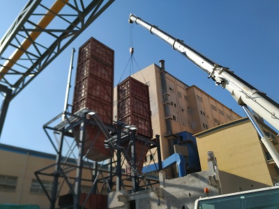由我公司承建的海城城海鸣矿业有限责任公司竖窑烟气脱硝SCR设备工程,前期完成一期一级、二级反应器的下料、制作、组装、焊接、除锈油漆等施工。在钢架具备安装的条件下,项目部和施工班组提前联系吊车并选定吊装位,提前丈量吊装距离、测量安装尺寸,并在安装处及对吊装反应器做好充足的准备,于2019年9月24日顺利将一期一级、二级反应器一次性吊装到位。